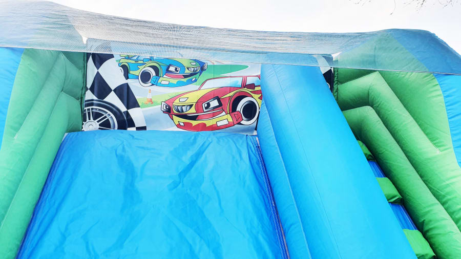The race car slide is sized perfectly for younger users and is designed with safety in mind. It is suitable for outdoor use on real grass or indoors on a hard surface, making it flexible for both garden parties and hall celebrations. A fitted rain and sun cover means it can handle unpredictable weather, while sturdy anchoring ensures it remains safe during play. Supervision by a responsible adult aged 18 or over is required at all times when the inflatable is in use.