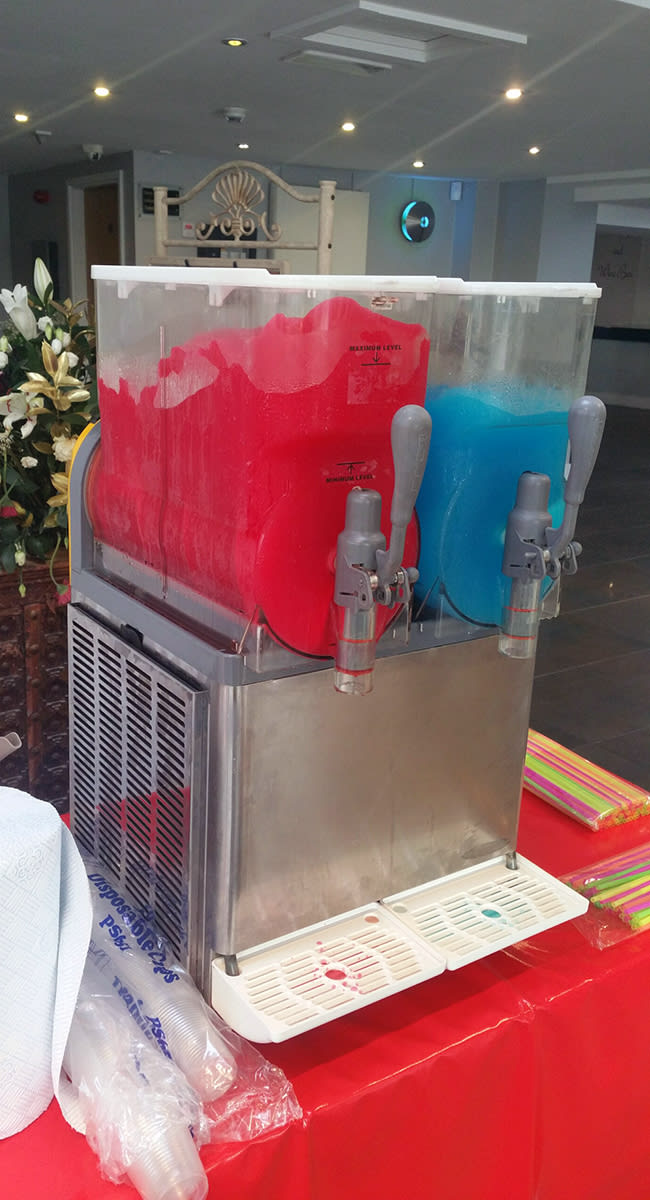 The great Slush machine makes great tasting icy beverages with multiple flavours available, please specify when booking which flavour you prefer with the choice of two per booking.